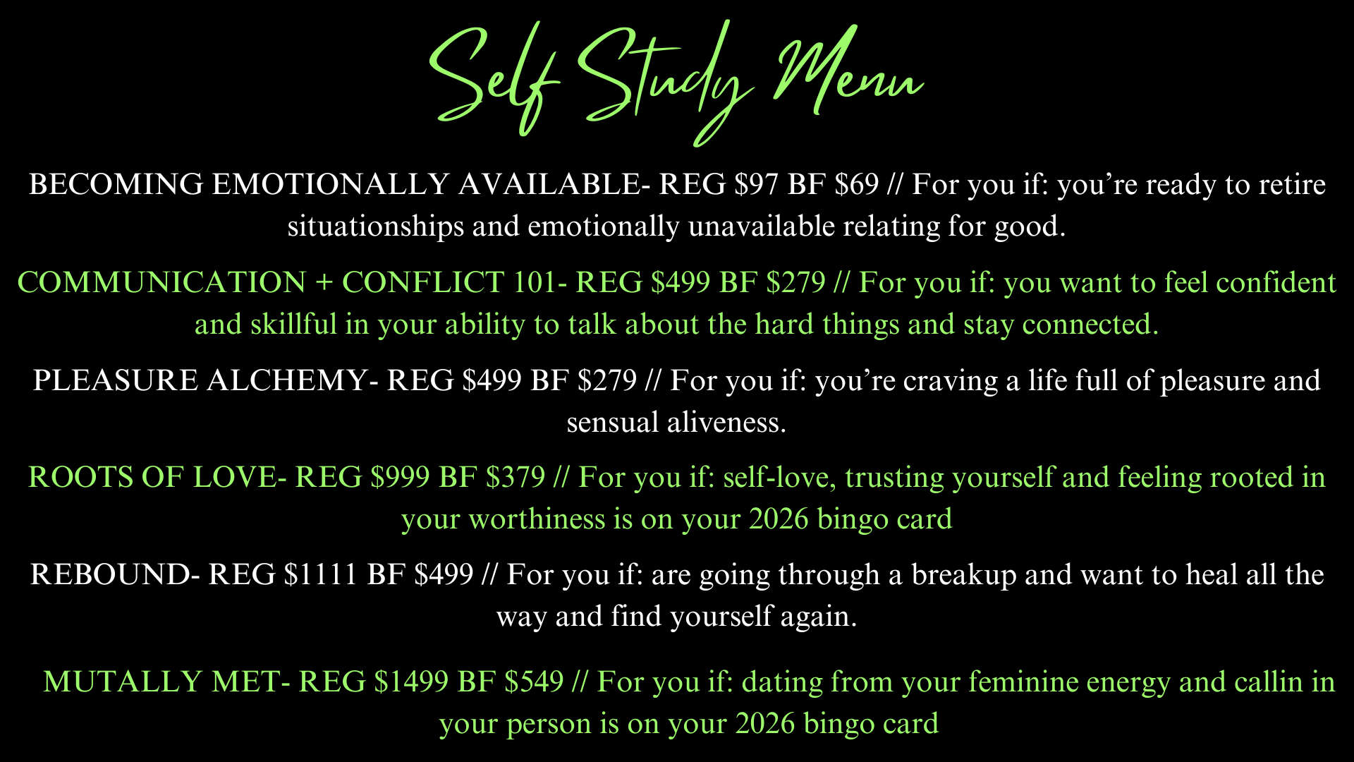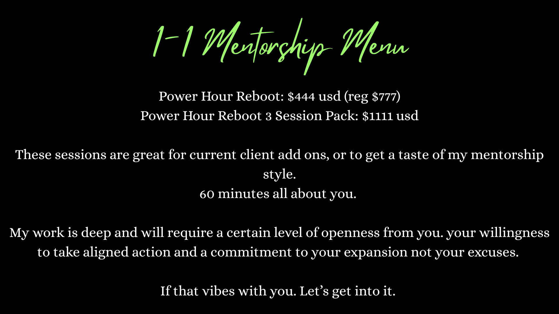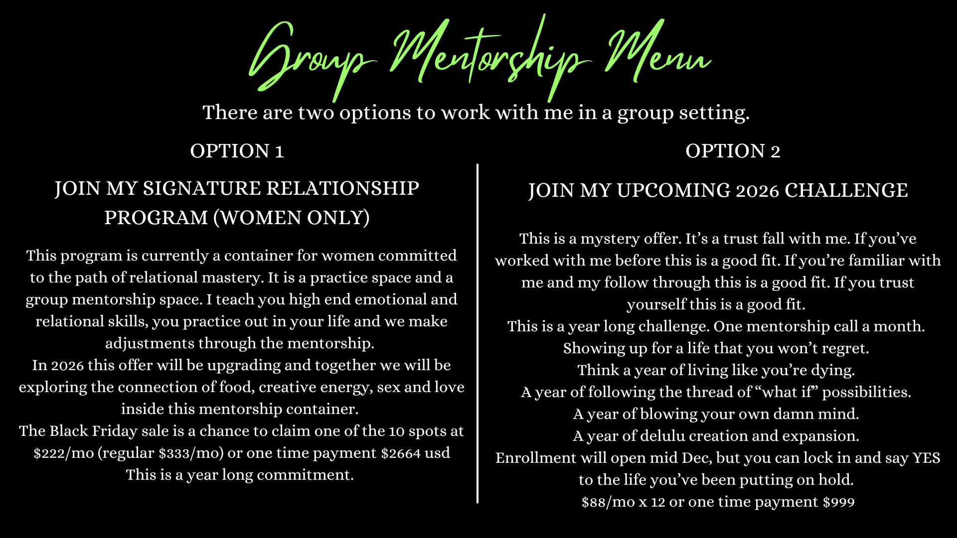 I like it deep, transformative and wildly ALIVE and if you're ready to bring the ZING back into your love life, your dating life, and your sex life... get yourself into the menu and feast your little heart out.